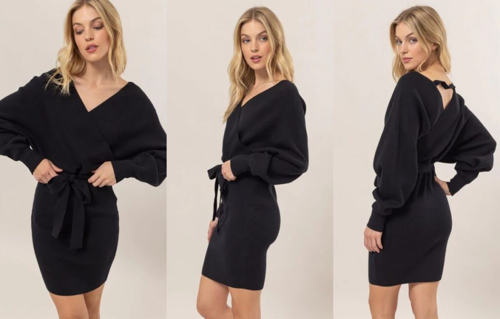 Wrap-Belt Sweater Dress | Side-tie or faux-wrap effect | Boutique, fashion-forward markets |